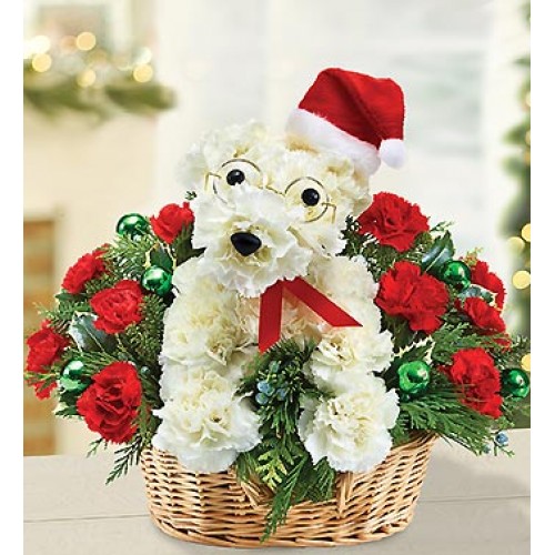 Aranjament in cos dre ratan cu un catel din garoafe sau crizanteme, garoafe, brad si globuri.