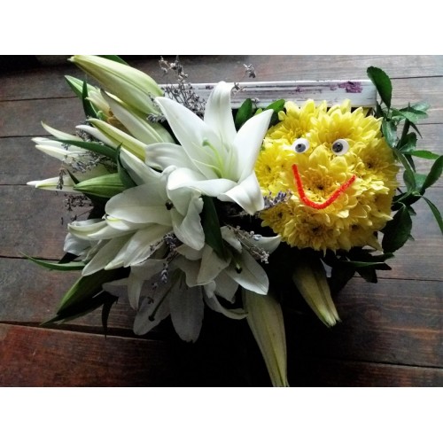 Smiley face din santini si crin imperial cu lavanda, in cutie carton.