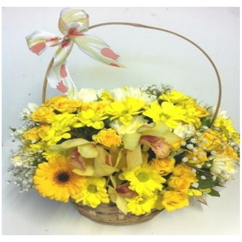 Aranjament floral in cos de ratan cu gerbera crizanteme minirosa orhidee gypsophila si plante