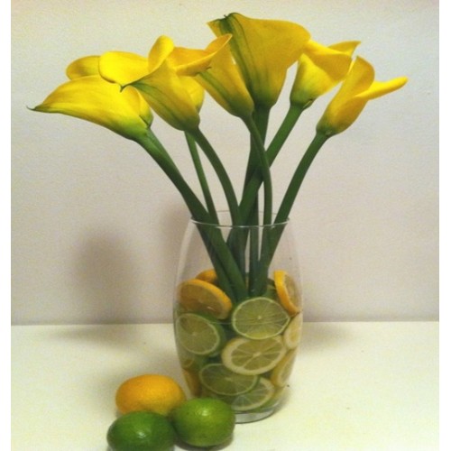 Aranjament floral in suport de sticla cu 9 fire cale lamai si limes