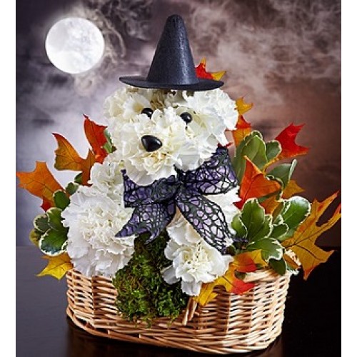 Aranjament floral cu catelus facut din garoafe sau crizanteme pentru halloween.