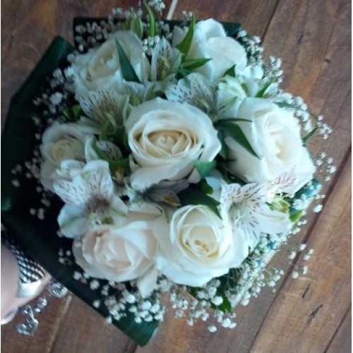 Buchet de mireasa cu forma circulara din 11 trandafiri alstroemeria si floarea miresei cu aspidistra