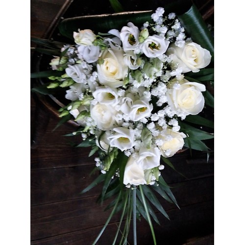 Buchet de mireasa din 9 fire trandafiri si 6 fire de lisianthus model curgator