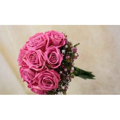 Buchet de mireasa rotund din trandafiri si gypsophila cu perle