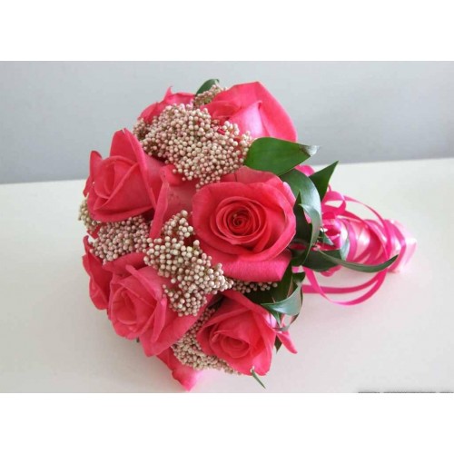 Buchet de mireasa rotund din trandafiri si floarea miresei
