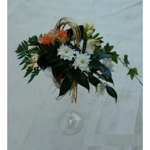 Aranjament floral din crizanteme minirosa frezii si plante